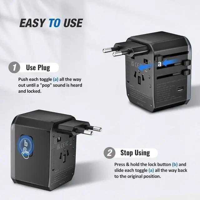 WORLDWIDE ADAPTER - Our all-in-one adapter is equipped with 4 different plug types that could plug into the sockets of 200+ countries and regions: Type C (most popular type) for use in most of Europe, including France, Germany, Italy, Spain, Iceland, Greece, and many other countries; Type G for UK, Ireland, HK, Malaysia, Singapore; Type I for China, Australia, New Zealand, Argentina; Type A for USA, Mexico, Canada, and Japan. It does NOT work in India and South Africa.