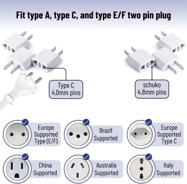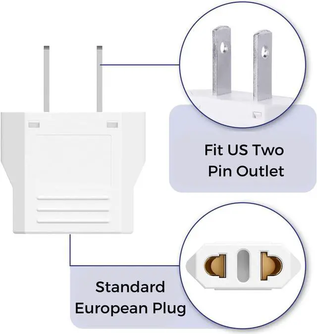 Package includes 3 pack European to American (two-prong) outlet plug adapter