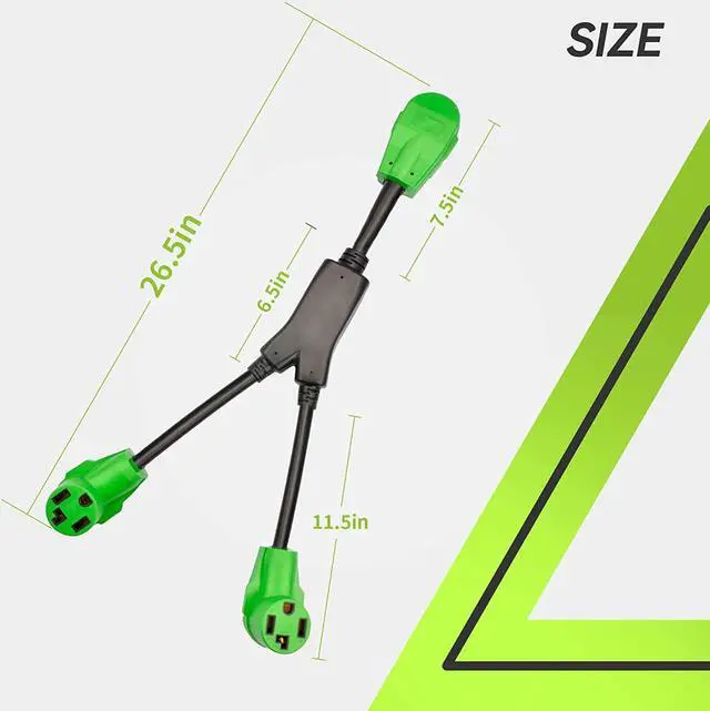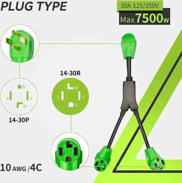 NEMA 14-30 male plug to (2) NEMA 14-30 female receptacle. 8/2 AWG+10/2 AWG.