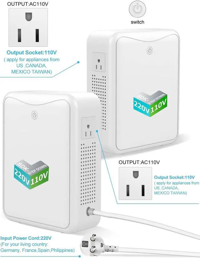 Upgraded designOur Upgraded 220 to 110 Voltage Converter is designed to be quieter, more efficient, and thinner than traditional bulky converters. It doesn' t produce noise, smell, or heat, and it has suction cups on the bottom to make it safer. You can put it in your living room or on your kitchen countertop.