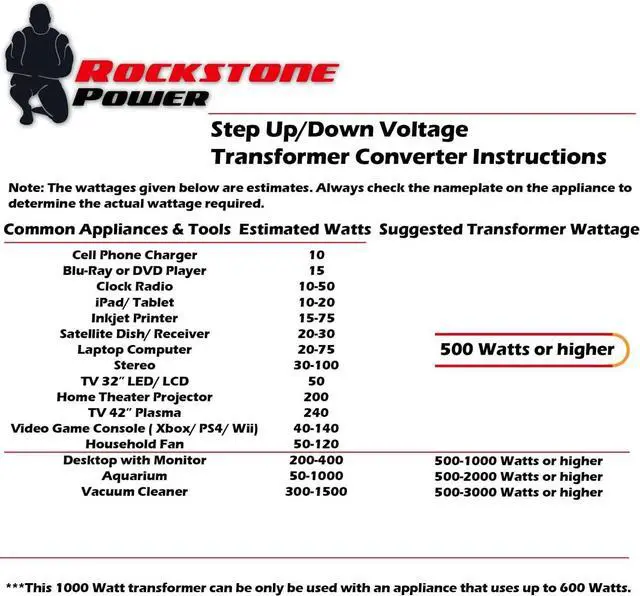 • For safety reasons, it's recommended to use a Voltage Converter/Transformer that's max watts is at least 50% higher than your appliance. For example; this 1,000 Watt transformer can be only be used with an appliance that uses up to 600 Watts that is to prevent damage from the transformer itself and the appliance being used.