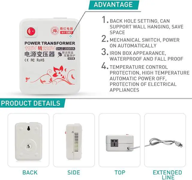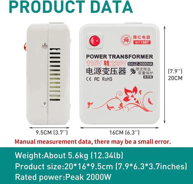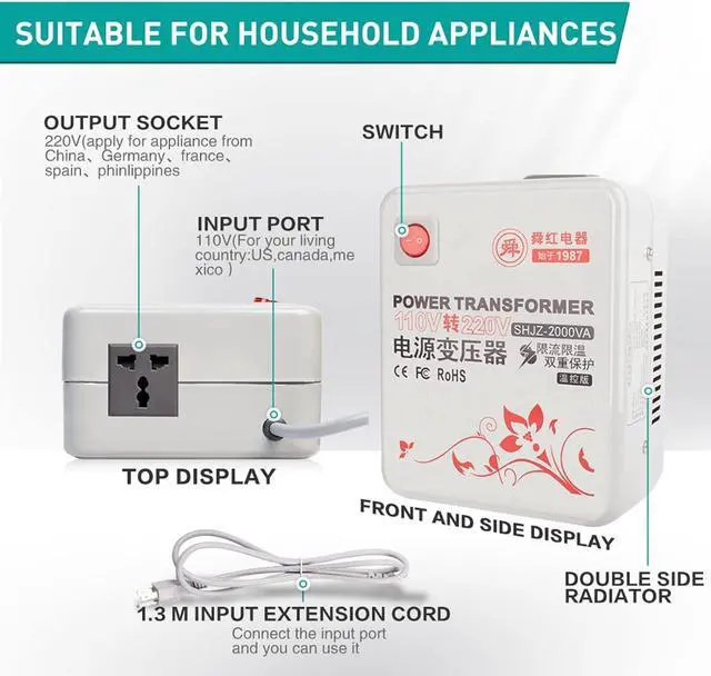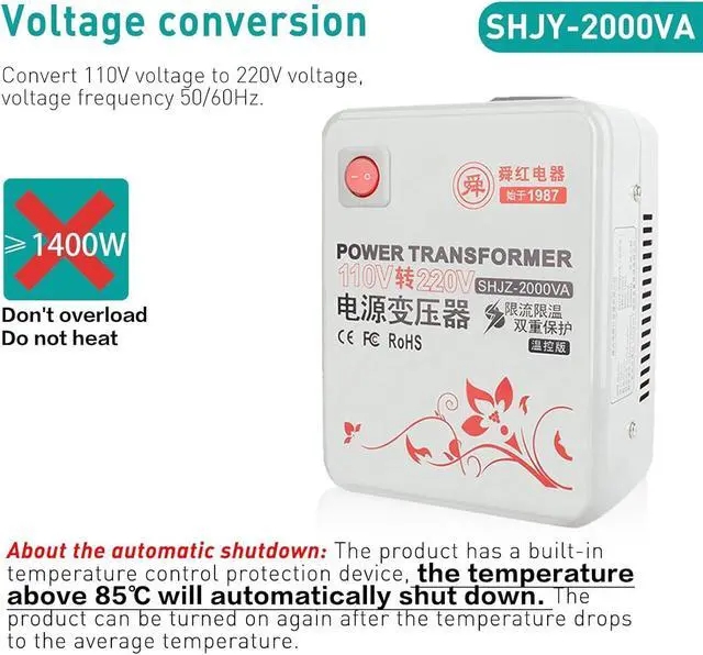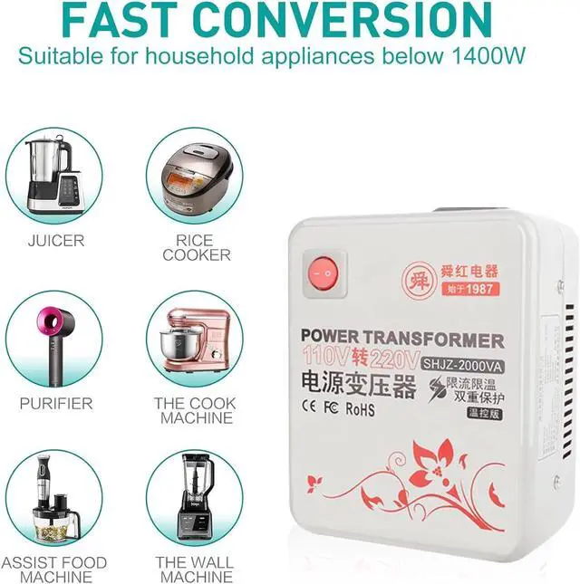 Range of use2000 watt step-up conversion transformer to step up voltage from 100V-120V to 220V-240V, supporting the use of appliances in the USA in the UK, Europe, China etc. However, please allow at least 30% for power surges/spikes.