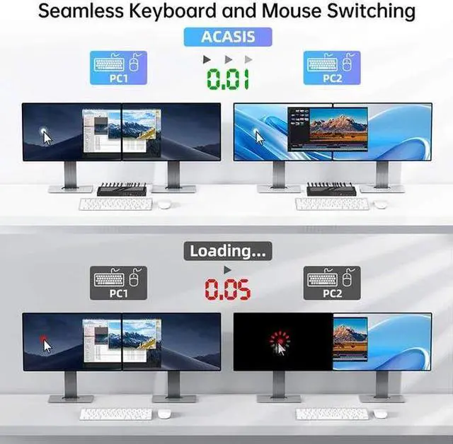 Whether you need to access multiple machines for office work, creative projects, entertainment, or gaming, this KVM consolidates multi-PC control into one desktop setup. Declutter and maximize productivity with the ACASIS KVM switch.