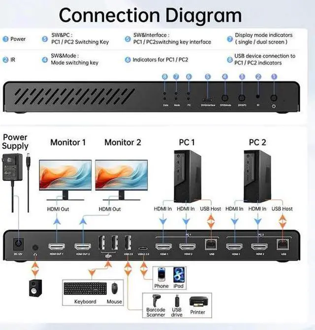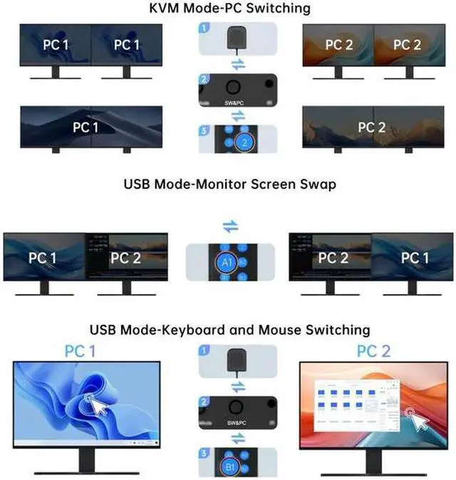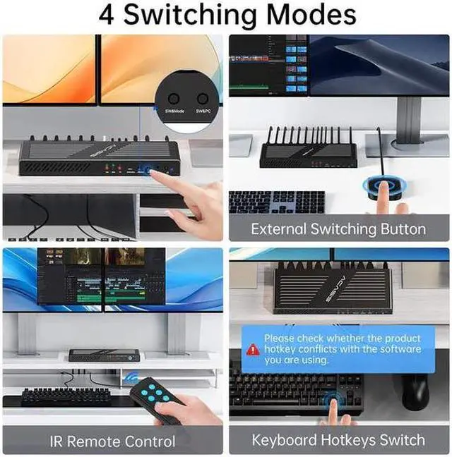 4 Switching Modes: ACASIS dual monitor KVM switch is equipped with a wireless remote and an IR remote control. Plus two switching methods, hotkey switching, and panel switching, providing a total of four convenient and flexible switching modes to choose from.