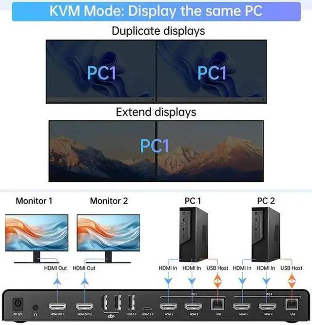 KVM Mode-Extended: In the extended mode, the KVM switch can easily achieve a display mode of extent or duplicate, displaying the content of one computer on two screens simultaneously, allowing for more information at a glance.