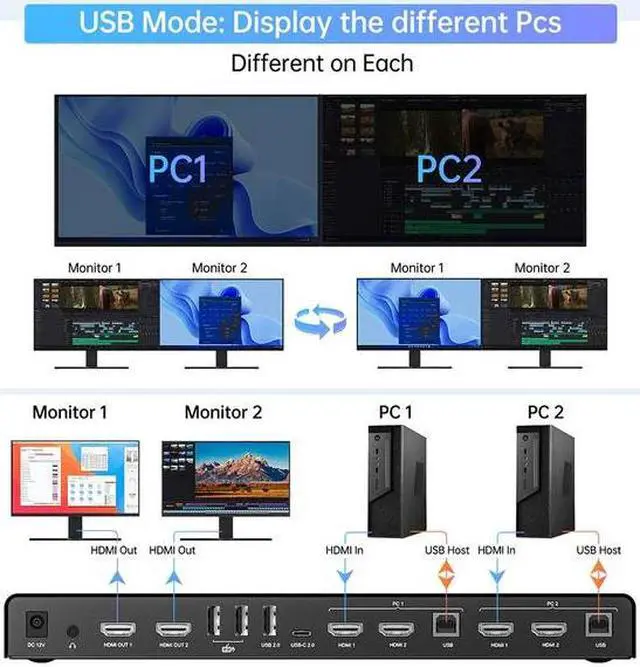 USB Mode: Under USB mode, the two monitors display content from two PCs respectively. Seamless switching of content between the two screens under the same mode saves you the hassle of reconnecting the device, ensuring an efficient and smooth use.