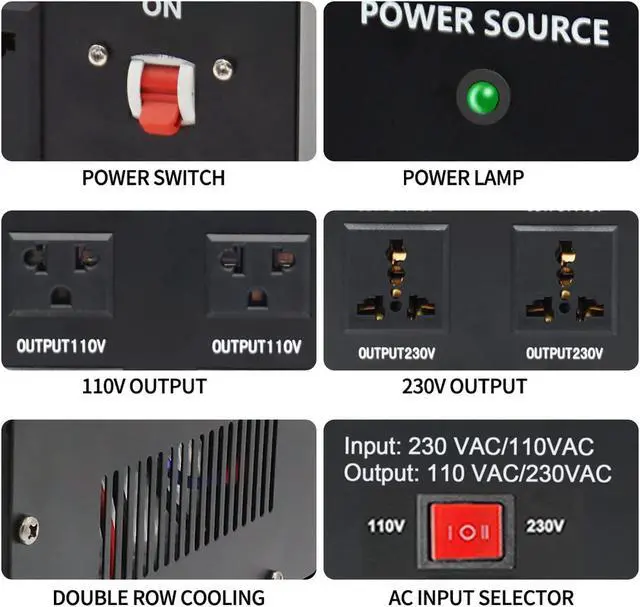 Sockets: 4 AC outputs, 2 US Standard Socket for 110-120V appliance (s) & 2 Universal Sockets accept all types of plugs except the Big South African plug for 220-240V appliance (s). The transformer can be used in countries which voltage are 90V125V or 180V250V such as US, EU, UK, JP and more.