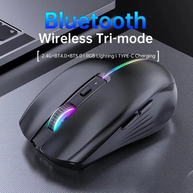 TRI-Mode Wireless Mouse: The green, blue, and red indication lights represent BT1, BT2, and 2.4G USB respectively, ensuring easy and convenient device connectivity.