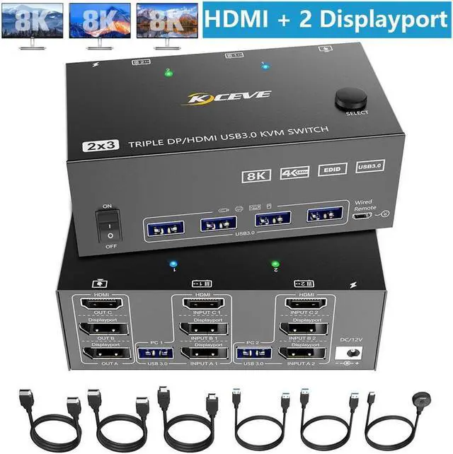 [8K DisplayPort KVM Switch 3 Monitors] The HDMI + 2 Displayport Triple Monitor KVM Switch [Display port]: support resolution up to 8K@30Hz/4K@144Hz. [HDMI]: support resolution up to 8K@60Hz/4K@120Hz and backward compatible with lower resolution.