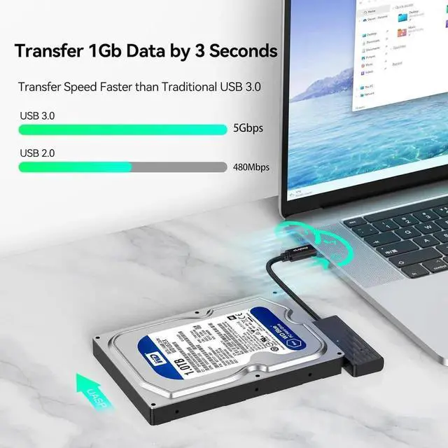 5Gbps high-speed transmissionThe usb sata adapter using USB3.0 high-speed interface, theoretical transmission speed up to 5Gbps, stable data transmission speed, to ensure the security of external hard disk data. Backward compatible with USB 2.0/1.1.Only support the capacity within 2TB.The actual rate will depend on the capability of your device.