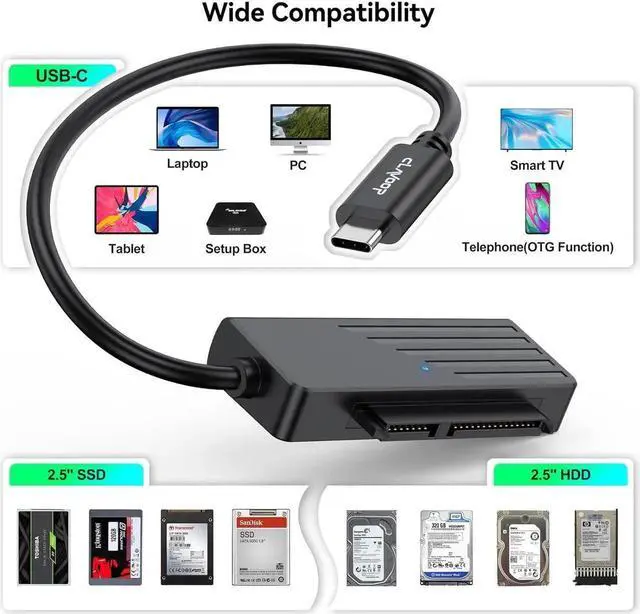 Standard SATA 2.5" SSD AdapterCLAVOOP sata to usb adapter connects to your computer or laptop via 2.5 "SSD, helping you easily expand drive space, upgrade systems, store, create disk images, back up files, and retrieve old hard drives to recover data. Quickly transfer content to your computer or laptop. (Note: Not support 3.5'' SSD & HDD!)