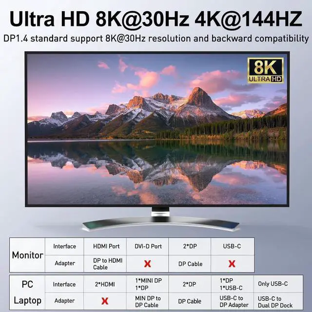 Support the highest resolution 8K@30Hz, 4K@144Hz, downward compatible.