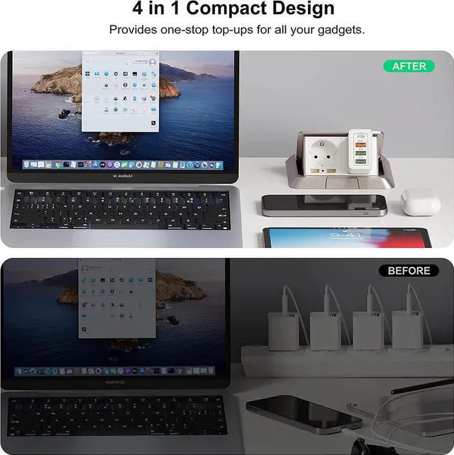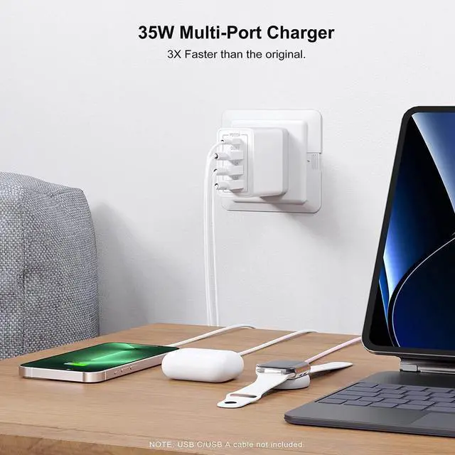 All: with totally 35W 4-Port designed (1X USB-C + 3X USB-A), allow users to simultaneously charge four devices. It can really save your time, best replacement for your original charger.