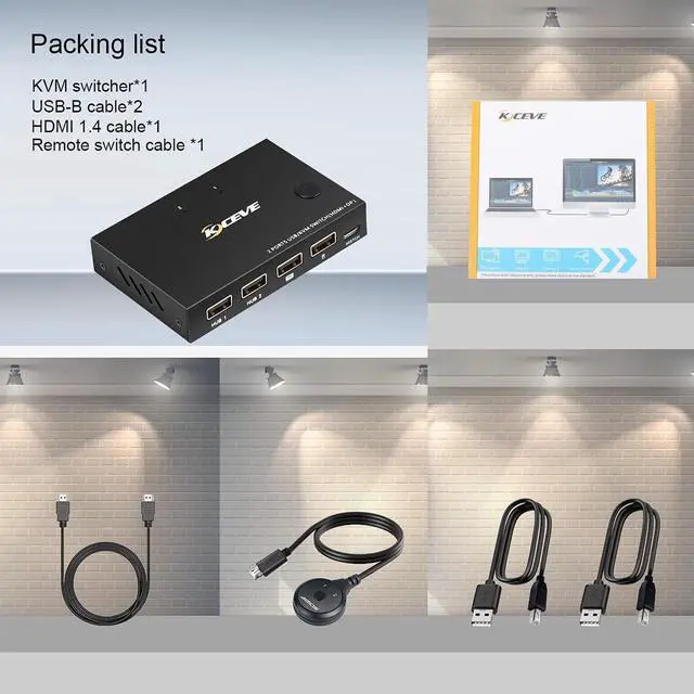4. KVM switch with 4 USB 2.0 ports. You can use it to share some devices such as printer, Scanner, USB camera, U disk etc, between two computer at will. Compatible with wireless keyboard and mouse.