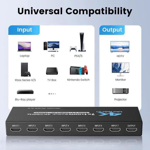 [Remote, Automatic, and Manual Switching] Our 7 port HDMI switcher 4k 60Hz offers 3 switching modes. With a remote control that has a range of up to 26 feet, can effortlessly switch your display content without leaving your couch. The automatic switching logic detects new input sources and switches to them automatically. You can also use your console controller or media player remote for easy switching. Lastly, if you're using this device on a desktop, manual switching is also very convenient.