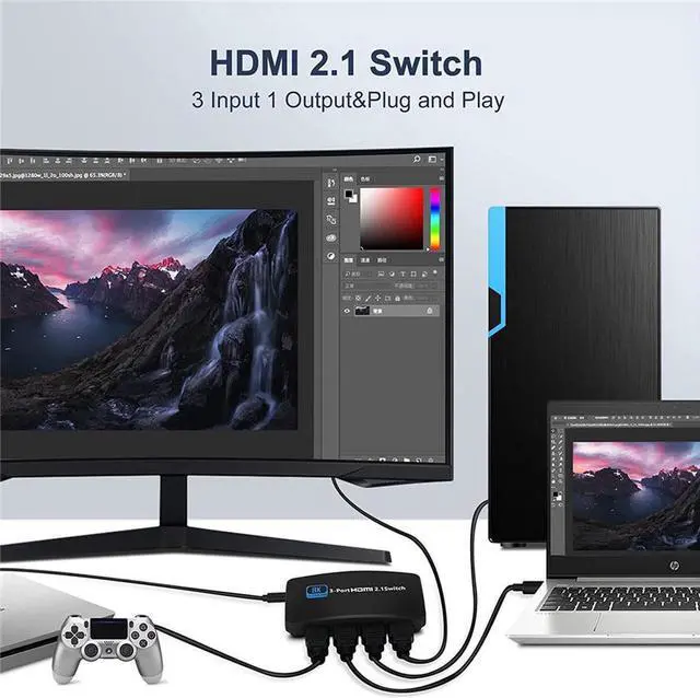 8K@60Hz 4K@120Hz HDMI Switch can connect three HDMI sources like blu-ray player and PS3, PS4, PS4 pro, PS5 etc, to a single HDMI display like HDTV. and you can switch the HD sources very conveniently by using IR remote control or the easy-click switch button on the unit. The system is compatible with HDMI-compatible 2.1, 3D and 8K Ultra HD.