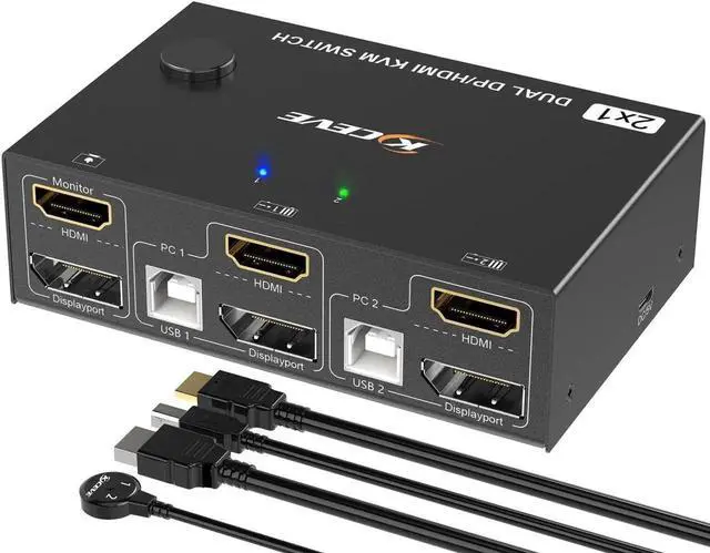 Dual Monitor KVM Switch HDMI & DisplayportThis dual monitor KVM switch allows to share 2 monitors and 1 set of keyboard and mouse between 2 computers or 2 laptops with HDMI and Displayport interfaces, Output support extended and copy display. Recommend to use 1 HDMI monitor and 1 Display Port monitor for the display outputs