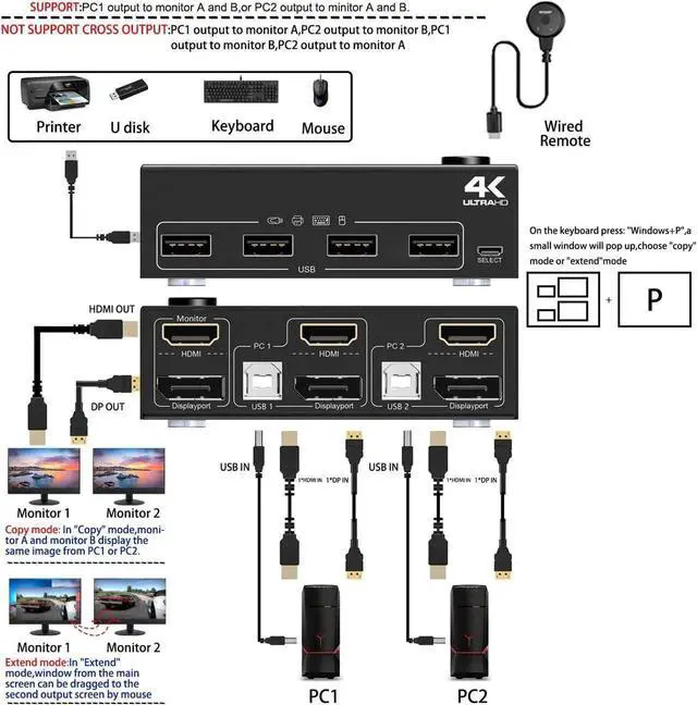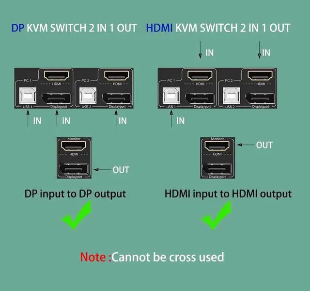 • Dual Monitor KVM Switch HDMI & DisplayportThis dual monitor KVM switch allows to share 2 monitors and 1 set of keyboard and mouse between 2 computers or 2 laptops with HDMI and Displayport interfaces, Output support extended and copy display.Recommend to use 1 HDMI monitor and 1 Display Port monitor for the display outputs