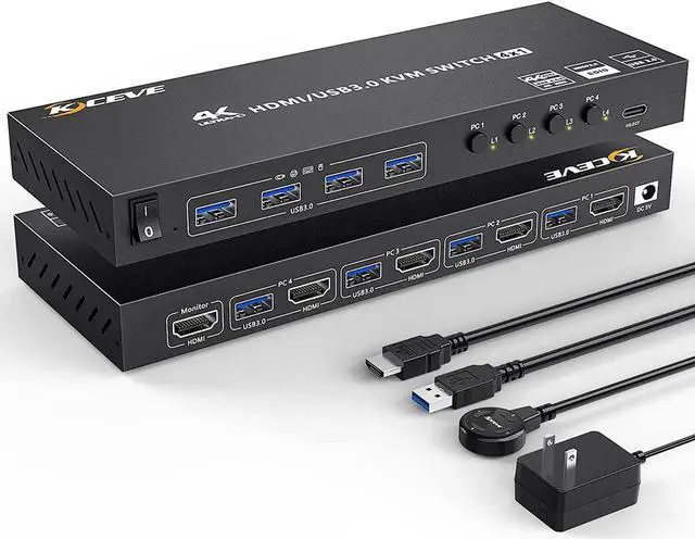 USB3.0 HDMI KVM Switch 4 in 1 outThis USB 3.0 KVM switch allows to control 4 computers with only 1 set of monitor mouse and keyboard. Making easily switch between 4 computers on 1 monitor and share 4 USB 3.0 devices.