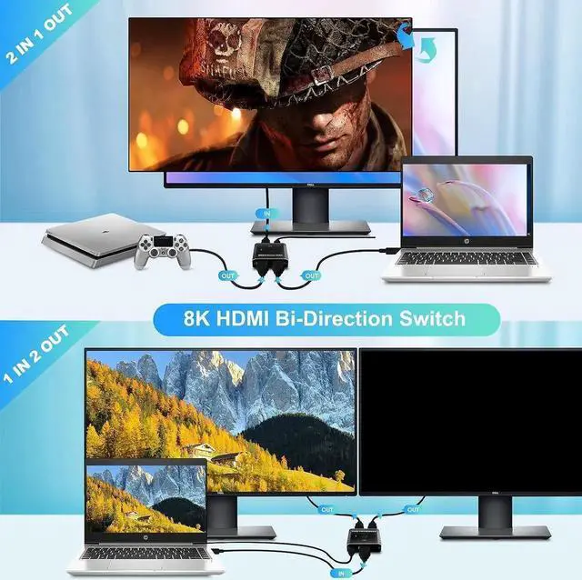 [HDMI Splitter Bi-directional Transmission] with this HDMI 2.1 switch, you can easily connect 2 sources to a display or switch between 2 displays from one source.