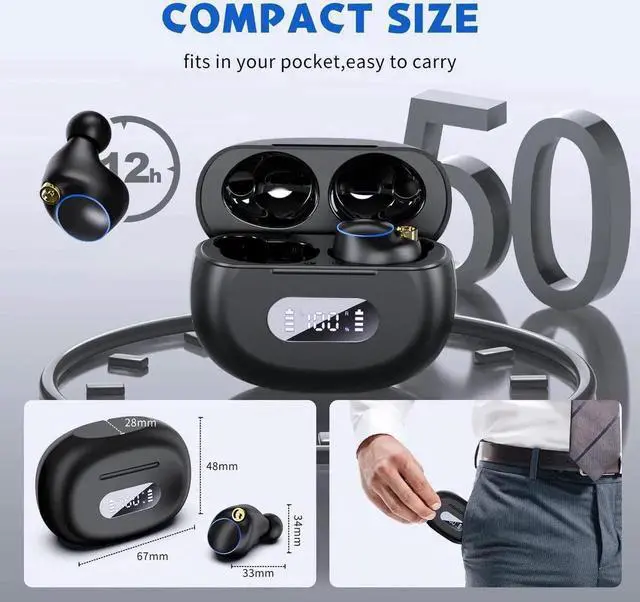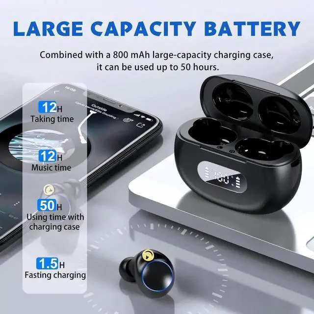 [50 Hours Battery Life & Large Capacity Charging Case] Provides about 12 hours of playback time on a single charge. Equipped with an 800 mAh high-capacity charging case, it can provide 5 charging times for the earbuds, so when used with the charging box, the playback time of the earphones can reach more than 50 hours.