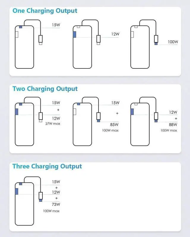 USB C PD 3.0 Output: DC 5V - 9V - 12V 3A, 15V 4.35A 65W, 20V 5A 100W Max.