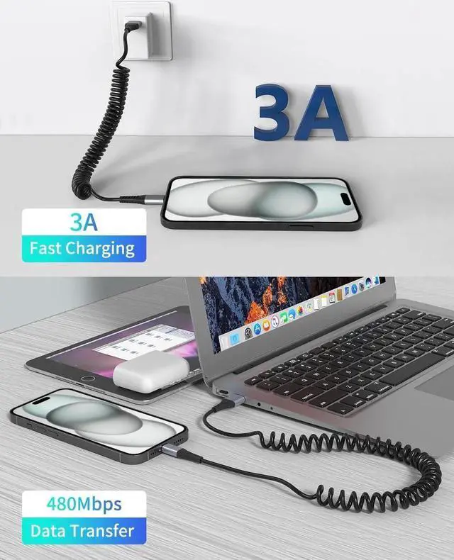 Fast Charge & Data SyncThe coiled usb c charger cable fast charging can provide 3A fast charging and 480Mbps data transfer speed. Built-in high purity copper wire ensures faster and more stable charging.