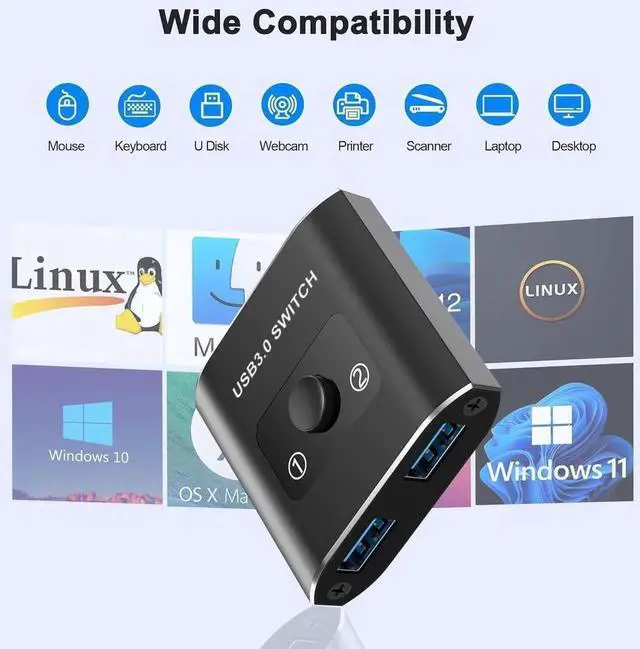 [Bi-Directional USB Switch 3.0 ] The USB switcher allows one button swapping between 2 computers to share 1 USB 3.0 peripheral device. OR switch 2 USB devices for 1 computer. A high-quality Aluminum shell is more durable, anti-fingerprint, and accelerates heat dissipation.