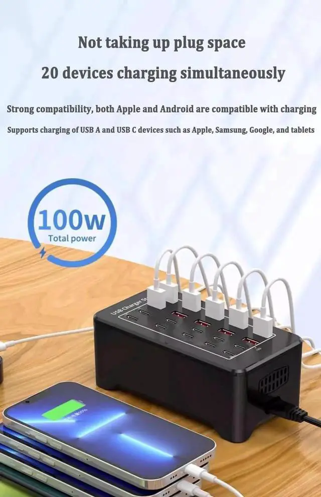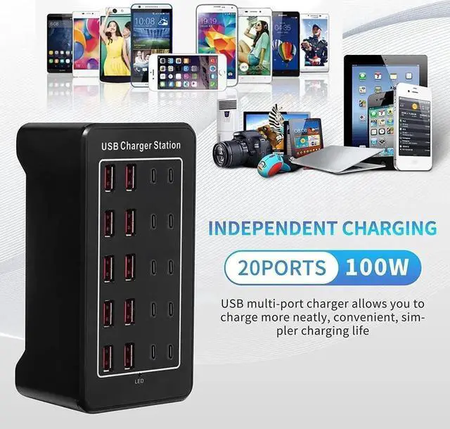 Multi-port USB charger station: 20 ports usb c fast charger, with 10port USB A + 10 port USB C charger, working efficiency reaches 80%, total output power is 100W. Compatible with Smartphones, Tablet, etc..