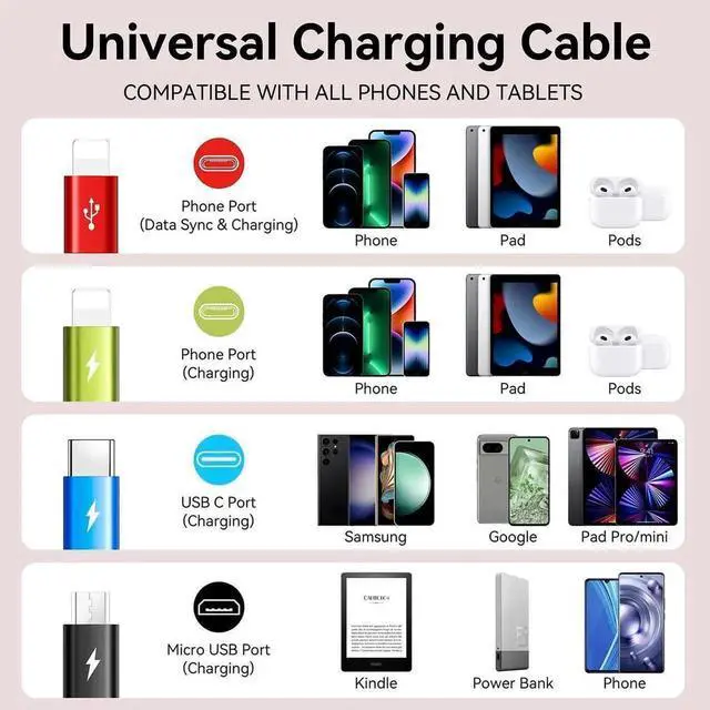 Multi-Function: 4 in 1 3.5A Nylon braided High Speed multi charging cord compatible with Phone 15 14 13 12 11 Pro Max / 15 14 13 12 11 Pro / 1413 12 Mini / 15 14 Plus / 15 14 13 12 11/ SE / Xs Max / Xs / Xr / X / 8 Plus / 8 / 7 Plus / 7 / 6s Plus / 6s / 6 Plus / 6 / 5 / 5s , Pad Air / Pro, Pod / replacement Nano 7 / Samsung Galaxy S22+ / S22 / S21+ / S21 / S20+ / S20 / 210+ / S10 / S9+ / S9 / S8+ / S8 / Note 7 8 9 10 20, Huawei, HTC, LG, Sony, Google Pixel , Moto, PS 4/5 and other Android devices for most mobile phone charging.
