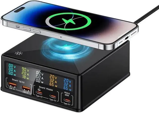[6-in-1 USB Charger] 160W multiple usb charging station designed with 3 parts smart outputs. with 2 USB C ports (up to 65W max) supporting PD 3.0 and QC4+/PPS/AFC/FCP protocols. QC 3.0 is up to 18W max. The QI Wireless Charging output compatible with 5W/ 7.5W /10W/15W.