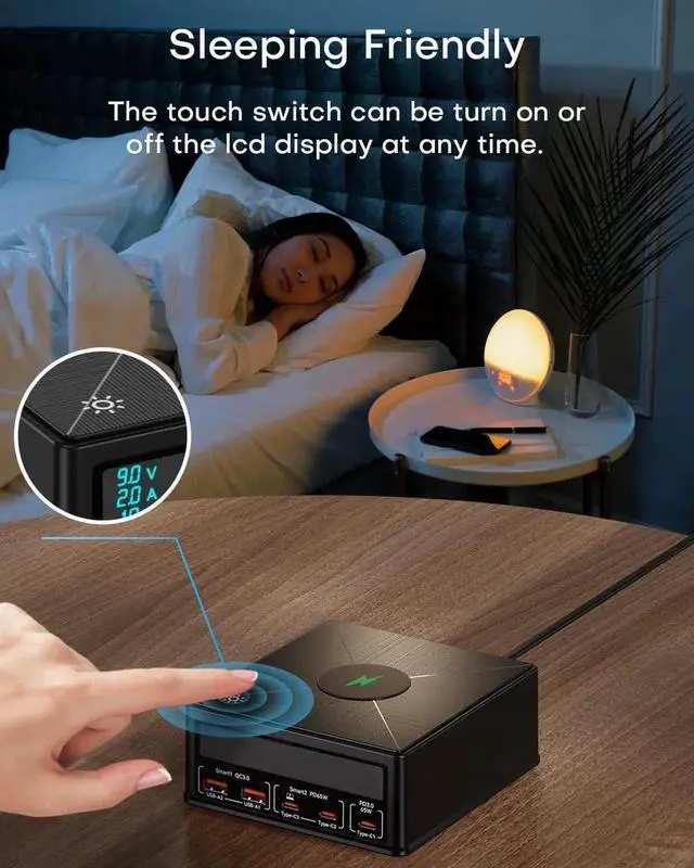 [Smart LCD Display] Equipped with an LCD digital display, shows the real time voltage, current and power of each port. The usb c charging station equipped with a screen touch button, which can be turn on or turn off at any time without affecting sleeping.