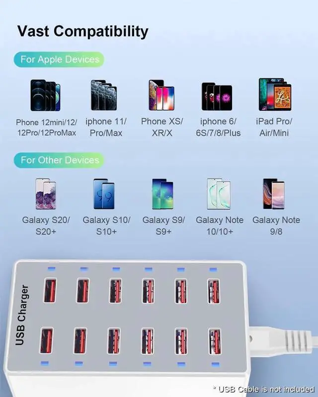 USB CHARGING HUB HAS PORTABLE SIZE: Mini sized usb charger station can save you valuable desk space while keeping 12 devices in one place for added organization (USB wall charger).