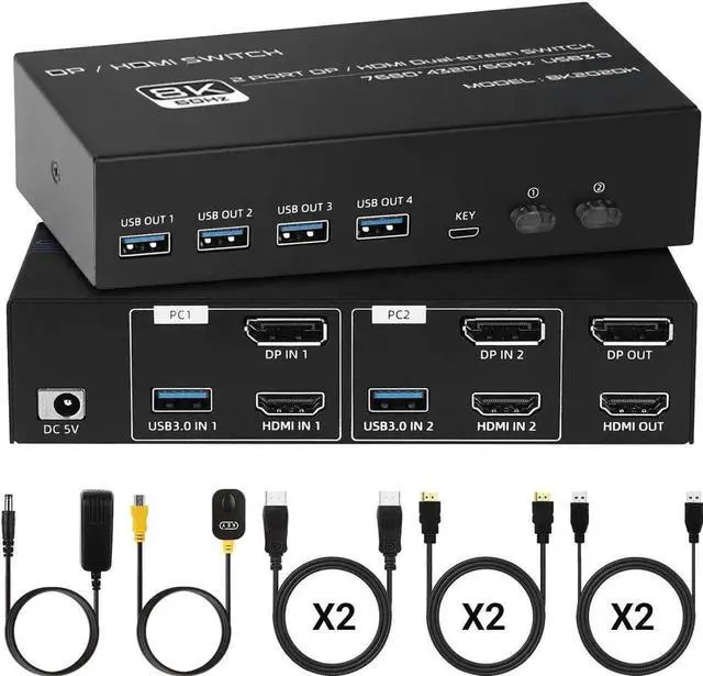The HDMI DP Dual Monitor KVM Switch allows you to share 4 USB 3.0 devices, 1 HDMI display device and 1 Displayport display device with 2 computers.