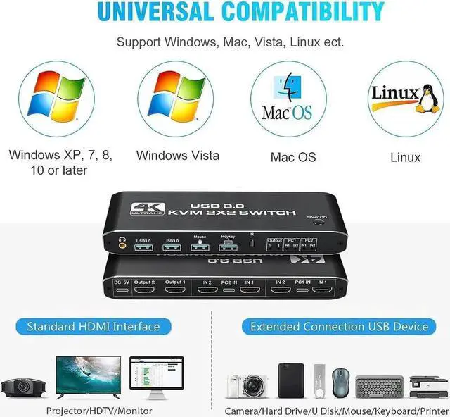 [with USB 3.0 Port] Plug and Play No Driver Required, 2 USB 2.0 Port for Wireless or Gaming Keyboard Mouse, and 2 USB 3.0 Port for Sharing USB Drives, Scanners, Webcams, etc. The USB 3.0 supports ultra-fast data transfer of up to 5 Gbps and is backward compatible with USB 2.0 / 1.1 devices.