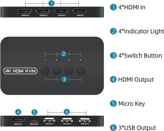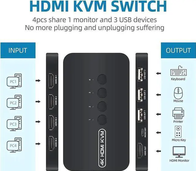 Ideal Sharing Switches: HDMI USB KVM Switch can share one HD 4K monitor and 3 USB 2.0 devices such as scanner mouse keyboard between 4 computers.