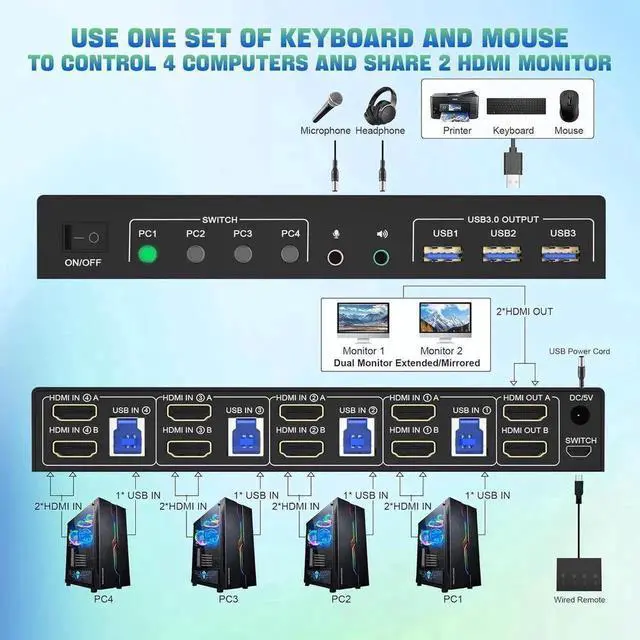 PCs: This KVM Switch allows you to control 4 computers or laptops with one set of keyboard, mouse, and dual monitors to make your workspace tidy and efficient.