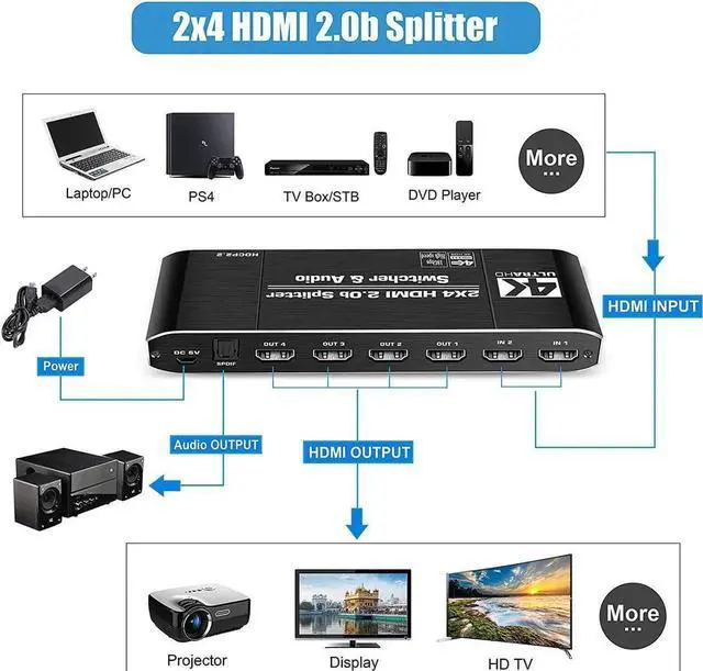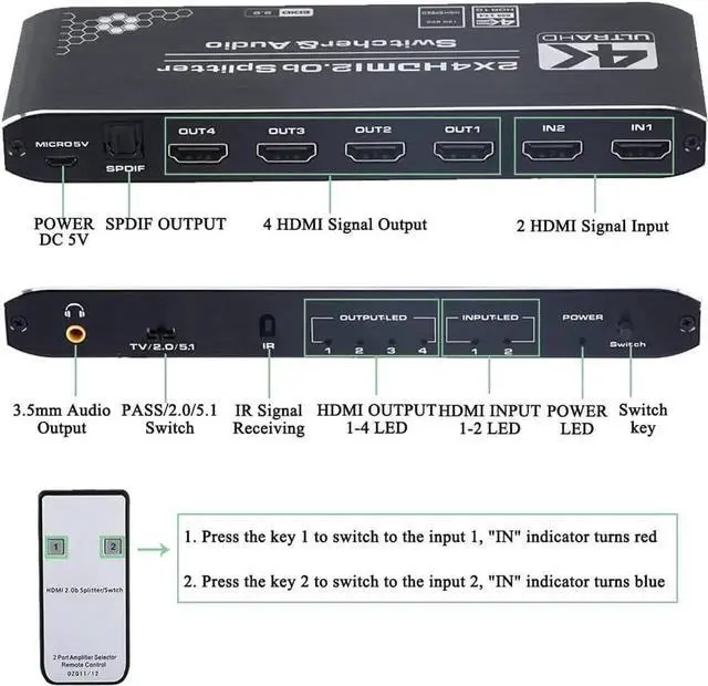4K HDMI Splitter 2x4,HDMI Switch 2 in 4 Out Switcher Box with Audio Extractor and IR Remote Control, Support Ultra 4K HDR,4Kx2K@60Hz, 3D, 1080P,HDMI 2.0b, HDCP 2.2