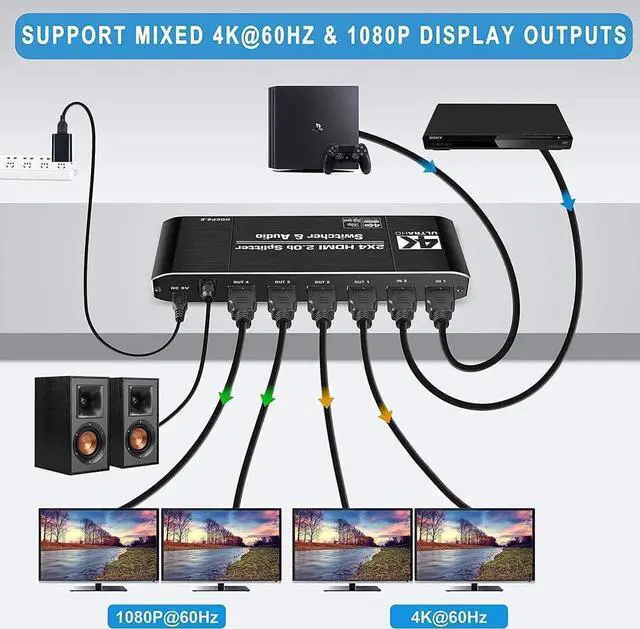 - 2 HDMI inputs switch and split to 4 HDMI displays