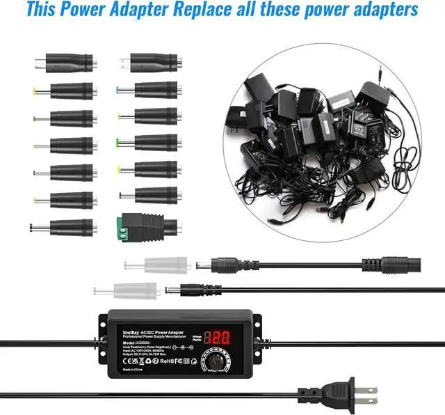 PACKAGE INCLUDED: 1pc Adjustable Power Supply, 1pc Reverse Polarity Cable, 14 pcs Inter-changeable adapter tips;
