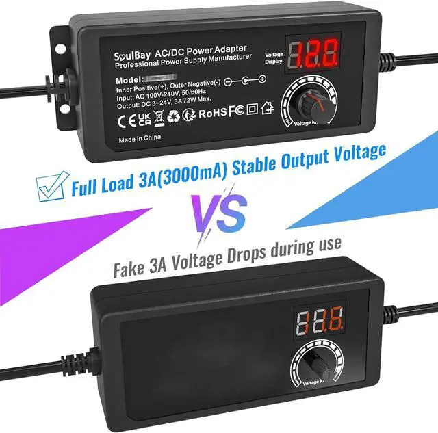 VARIABLE VOLTAGE: This power supply features adjustable, and allows for use for most electronics within DC 3V to DC 24V output voltage, simply adjust the voltage knob and choose the right volt via the voltage display to use