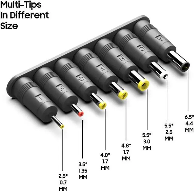 Connector size: 5.5 * 2.5 mm barrel plug With 7 Selectable Tips ( 6.5 * 4.4 mm/ 5.5 x 2.5 mm/ 5.5 x 3.0 mm/ 4.8 x 1.7 mm/ 4.0 x 1.7 mm/ 3.5 x 1.35 mm/ 2.5 x 0.7 mm)