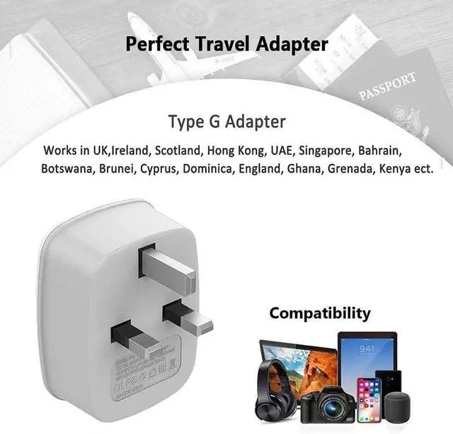 UK Plug Adapter: This UK travel plug adapter compatible in most overseas countries such as UK, Ireland, Dubai, Scotland, Hong Kong, Bahrain, Belize, Botswana, Brunei, Cyprus, Dominica, England, Ghana, Gibraltar, Grenada, Iraq, Kenya, Macau, Malaysia, Nigeria, Nothern Oman, Qatar, Saint Vincent, Saudi Arabia, Singapore, Sri Lanka, Uganda, the UAE, Yemen and ect
