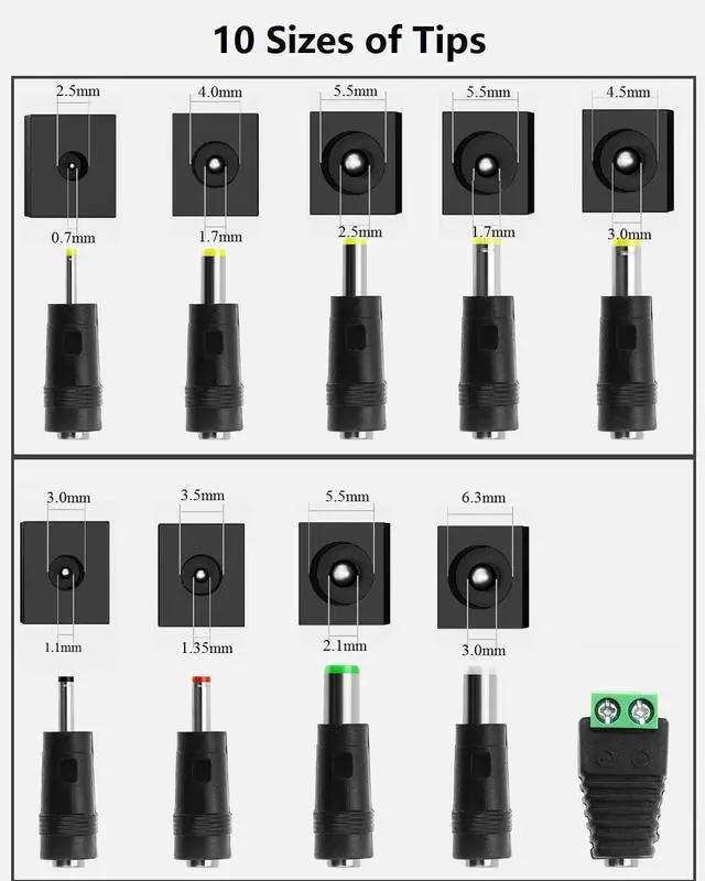 10 more Sizes of Tips 2.5 x 0.7 mm, 4.0 x 1.7 mm, 5.5 x 2.5 mm, 5.5 x 1.7 mm, 4.5 x 3.0 mm, 3.0 x 1.1 mm, 3.5 x 1.35 mm, 5.5 x 2.1 mm, 6.3 x 3.0 mm, DC Terminal connector. This 11-in-1 12Volt 1.5A universal power adapter kit greatly expands its application scope.