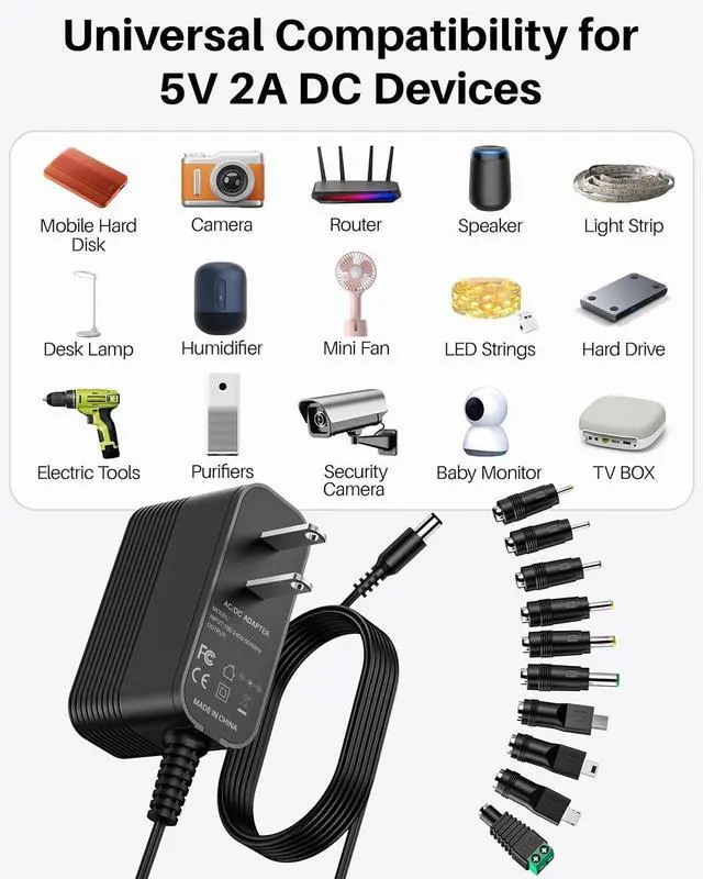 10 Interchangeable Jacks: Selected 10 pieces multi connectors which can be used for most of your 5V DC power supply devices. 5V 2A power supply for electronics regulated switching, regulated 5V, power cord replacement charging for your DC 5V 2A max input devices, which can charge quickly to save your precious time and bring a comfortable charging experience for you