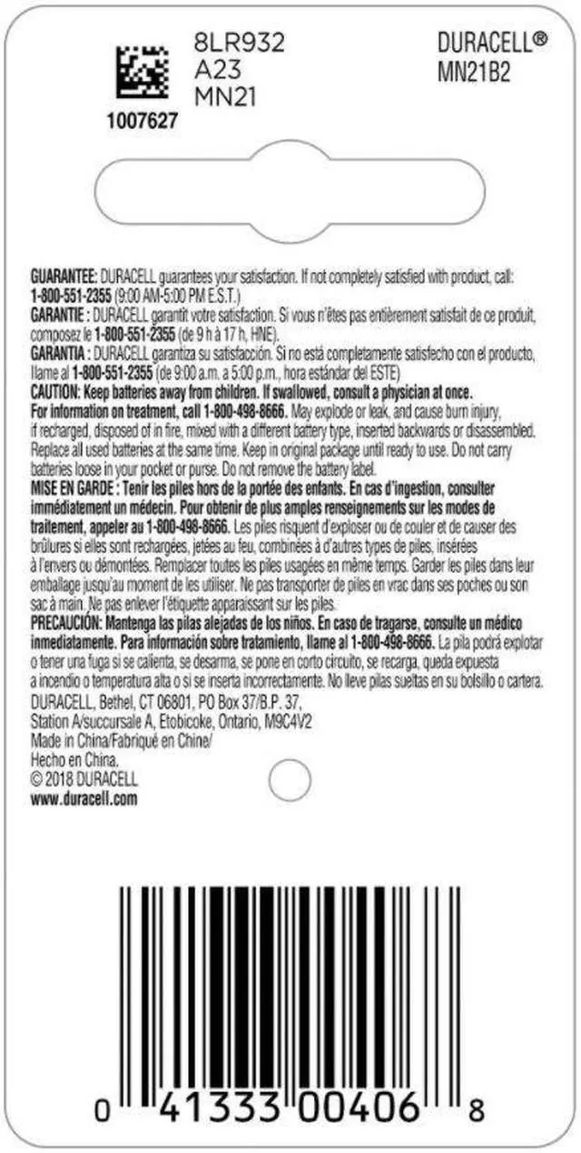 Battery, Battery Size 21/23, Battery Chemistry Alkaline, Voltage - Batteries 12V DC, Standard Battery Pack Size 2, Capacity - Batteries 60 mAh, Battery Cross-Reference A23BPZ, A23BPZ-2, Application Remote Control, Terminal Type - Batteries Button, Diameter 0.39 in, Height 1.08 in, Max. Operating Temp. 140 Degrees F, Min. Operating Temp. 14 Degrees F, Standards ANSI, Package Quantity 2. This item has been restricted from sale in the following state (s): []