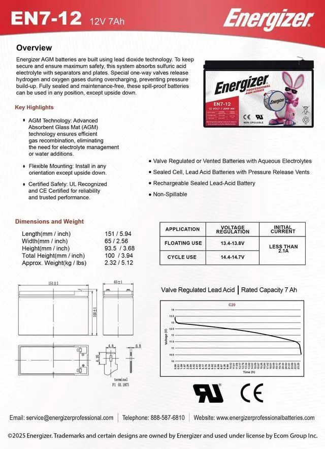 ENERGIZERS EXPERTISE: Our non-spillable design, powered by Absorbent Glass Mat (AGM) technology, ensures efficient gas recombination and virtually eliminates the need for maintenance. Say goodbye to electrolyte maintenance and water adding - enjoy hassle-free operation with reliable power developed by professionals.