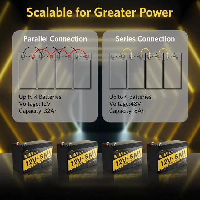 Flexible ExpansionOur lithium batteries support wiring in series to create a 24V/36V/48V 8Ah battery bank system. Additionally, they can be wired in parallel to build a 12V 16Ah/24Ah/32Ah system. Furthermore, you can connect up to 16 batteries in both series and parallel to construct a robust battery bank system with a total capacity of 1638Wh. Kindly note that ensure all batteries are fully charged individually before connecting in series. Battery BMS is 5A so single battery maximum withstandable power is 73w.