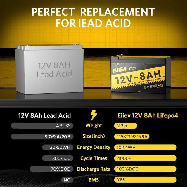 Longer Lifetime, Lower Costs Eiiev 12V 8Ah LiFePO4 batteries have a lifespan of over 4, 000 cycles, which is much longer than the 300500 cycles of lead-acid batteries. Unlike SLA batteries, which can only discharge by 4060%, our lithium batteries can discharge by 100%, which extends the time between replacements. While LiFePO4 batteries may have a slightly higher initial cost than lead-acid alternatives, their extended lifespan and superior cycle performance lead to a lower cost of ownership.