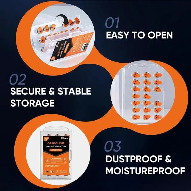 Easy to Access & Carry These zinc-air hearing aid batteries come in a square hard plastic case with a sturdy, crush-resistant structure that stays firm and stable when stacked. Individual compartments let you take only what you need, eliminating waste; seal up the rest and slip them easily into your pocket or pillbox for hassle-free on-the-go use.